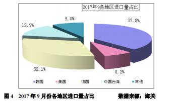 第一,從韓國(guó)進(jìn)口量仍位居第一。9月份從韓國(guó)進(jìn)口量為6671噸,環(huán)比增加3.4%,占9月份總進(jìn)口量的37.8%,占韓國(guó)月總產(chǎn)能的97.6%,即幾乎全部產(chǎn)出供往中國(guó)。1-9月份累計(jì)自韓國(guó)進(jìn)口量達(dá)到53254噸,占累計(jì)總進(jìn)口量的44.3%。