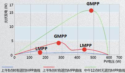 當(dāng)逆變器遇到這種情況(陰影遮擋)時,如果逆變器沒有合適的“陰影掃描算法”,使用常規(guī)的算法會難以找到最大功率點(diǎn)。同時,由于具有多個波峰,波峰高度不同,逆變器可能追到到最低的那個點(diǎn),系統(tǒng)損失相對更大。另外,盡管一些逆變器能夠在電壓范圍內(nèi)全局掃描追蹤最大功率點(diǎn),保證光伏系統(tǒng)的輸出。實(shí)際上最好的方案還是沒有陰影遮擋。