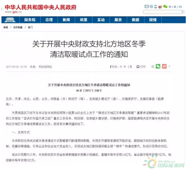 今年5月份,國家發(fā)布《關(guān)于開展中央財(cái)政支持北方地區(qū)冬季清潔取暖試點(diǎn)工作的通知》。