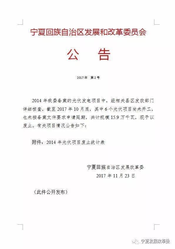 日前,寧夏發(fā)改委發(fā)布公告廢止6個截止10月底尚未開工的光伏項目,總規(guī)模共計15.9萬千瓦,上述項目都是于2014年備案的項目。