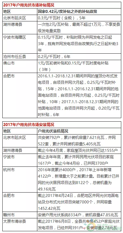 根據(jù)《電力發(fā)展“十三五”規(guī)劃》,到2020年太陽能發(fā)電裝機達到110GW以上,其中分布式光伏60GW以上、光熱發(fā)電5GW。能源局在發(fā)布的《太陽能發(fā)展“十三五”規(guī)劃》中提出,到2020年建成100個分布式光伏應(yīng)用示范區(qū),園區(qū)內(nèi)80%的新建建筑屋頂、50%的已有建筑屋頂將安裝光伏發(fā)電,粗略估算分布式項目產(chǎn)值約萬億。為響應(yīng)國家號召,多個省市地區(qū)紛紛頒布利好行業(yè)發(fā)展的補貼政策,2017年分布式光伏市場蓬勃發(fā)展,新產(chǎn)品、新模式、新業(yè)態(tài)層出不窮。