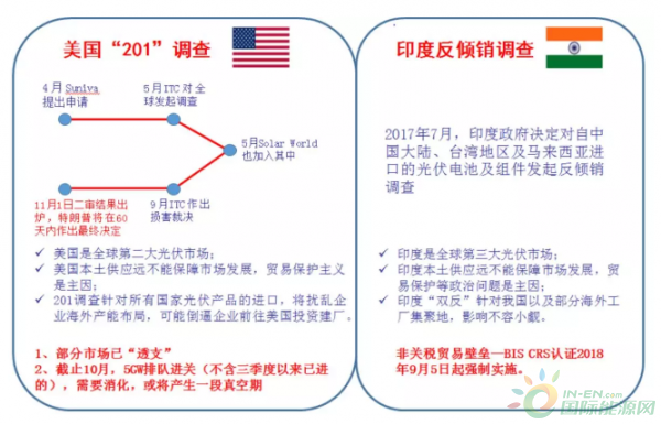 光伏作為朝陽性、戰(zhàn)略性、民生性占優(yōu)勢的產(chǎn)業(yè),已具備了極強的國內(nèi)影響力和較強的國際競爭力。美國和印度是全球第二大和第三大光伏市場。2017年前三季度,我國分別向美國、印度出口光伏組件3.735GW、6.877GW,占出口總量的20.3%、37.5%。2017年中旬起,美、印相繼對我國光伏產(chǎn)品發(fā)起反傾銷調(diào)查,調(diào)查結(jié)果可能導(dǎo)致2018年出口量驟減,而今年很多行業(yè)龍頭都在大力擴產(chǎn)能,龐大的產(chǎn)能將難以借外需充分釋放。在美、印市場面臨嚴重收縮的前提下,2018年國內(nèi)分布式光伏或?qū)⒊蔀榍藙赢a(chǎn)業(yè)的新支點。
