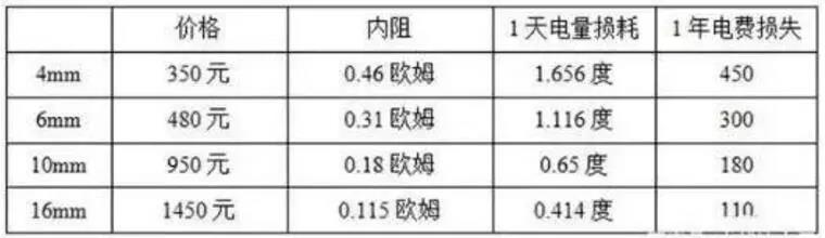 如一臺20kW電站,逆變器到并網(wǎng)點3根電纜線總長度100米,平均一天日照時間為4小時,輸出電流按32A,輸出電纜可以選用4mm,6mm和10mm,16mm。4平方電纜總內(nèi)阻0.46歐姆,市場價格是3.5元/米;6平方電纜總內(nèi)阻0.31歐姆,市場價格是4.8元/米;10平方電纜總內(nèi)阻0.18歐姆,市場價格是9.5元/米;16平方電纜總內(nèi)阻0.115歐姆,市場價格是13.5元/米。