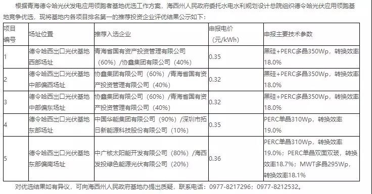 根據(jù)青海德令哈光伏發(fā)電應(yīng)用領(lǐng)跑者基地優(yōu)選工作方案,海西州人民政府委托水電水利規(guī)劃設(shè)計總院組織德令哈光伏應(yīng)用領(lǐng)跑基地競爭優(yōu)選,現(xiàn)將基地內(nèi)各項目排名第一的推薦投資企業(yè)評優(yōu)結(jié)果公示如下: