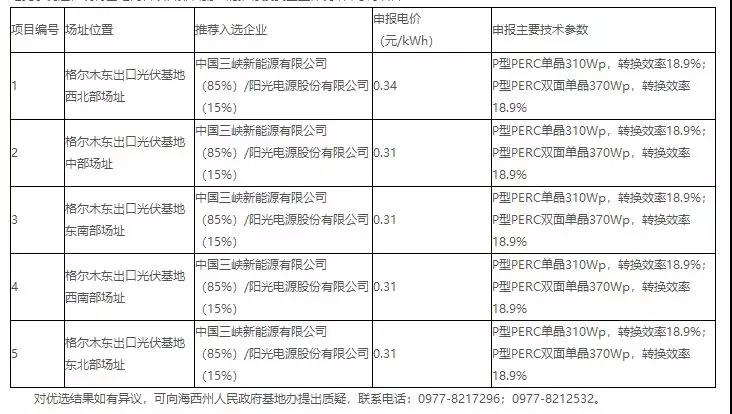 根據(jù)青海格爾木光伏發(fā)電應(yīng)用領(lǐng)跑者基地優(yōu)選工作方案,海西州人民政府委托水電水利規(guī)劃設(shè)計總院組織德令哈光伏應(yīng)用領(lǐng)跑基地競爭優(yōu)選,現(xiàn)將基地內(nèi)各項目排名第一的推薦投資企業(yè)評優(yōu)結(jié)果公示如下: