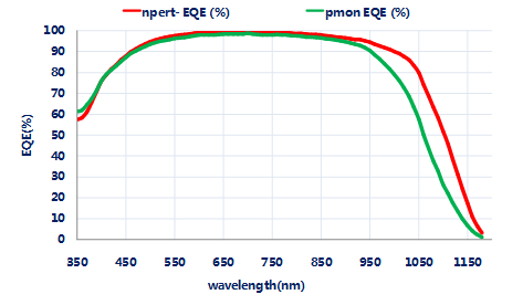 通過(guò)EQE測(cè)試結(jié)果可知(如圖2),相比于P型常規(guī)電池,nPERT電池具有更好的長(zhǎng)波響應(yīng),可將更多長(zhǎng)波長(zhǎng)的光吸收,尤其是制備成雙玻組件后背面可更高效率的吸收反射光和散射光。
