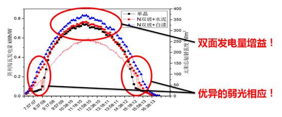 由于nPERT電池本身具有長(zhǎng)波響應(yīng)好的特點(diǎn),結(jié)合雙玻組件雙面受光條件,可在早晨和傍晚實(shí)現(xiàn)發(fā)電量的增益,下圖為三組光伏陣列單日的發(fā)電量跟蹤曲線(xiàn),將nPERT雙玻組件在兩種不同反射條件下與常規(guī)P型單晶進(jìn)行比較,可見(jiàn)在早晚兩個(gè)時(shí)段,nPERT雙玻組件有更好的弱光發(fā)電量保證。