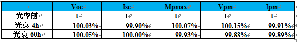 nPERT雙面電池采用N型硅作襯底,具有少子壽命高、無(wú)光致衰減等優(yōu)點(diǎn)。常規(guī)P型電池由于使用硼摻雜的硅襯底,長(zhǎng)時(shí)間光照后易形成硼氧鍵,在基體中捕獲電子形成復(fù)合中心,導(dǎo)致3~4%的功率衰減;而nPERT電池使用N型硅襯底,磷摻雜的基體使得電池幾乎無(wú)光致衰減。我們對(duì)nPERT電池進(jìn)行了光衰實(shí)驗(yàn)驗(yàn)證,如表1結(jié)果所示,光照60h后效率衰減僅0.11%,無(wú)光致衰減的特點(diǎn)能有效保證系統(tǒng)端的功率輸出和發(fā)電量。
