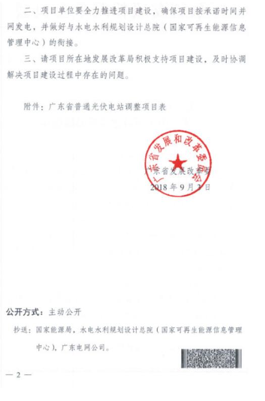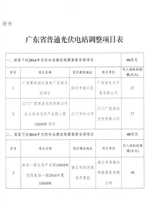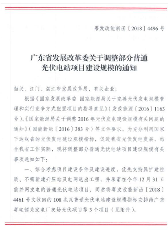 月3日,廣東省發(fā)改委下發(fā)《關(guān)于調(diào)整部分普通光伏電站項(xiàng)目建設(shè)規(guī)模的通知》,綜合考慮項(xiàng)目建設(shè)條件及建設(shè)進(jìn)度,優(yōu)先支持屬擴(kuò)建性質(zhì)、不需新建升壓站及電網(wǎng)送出工程,并承諾在今年12月31日前并網(wǎng)發(fā)電的普通光伏電站項(xiàng)目,同意將粵發(fā)改能新函【2018】4461號(hào)文件收回的108兆瓦普通光伏電站建設(shè)規(guī)模指標(biāo)安排給廣東粵電韶關(guān)發(fā)電廠灰場(chǎng)光伏項(xiàng)目等3個(gè)項(xiàng)目。