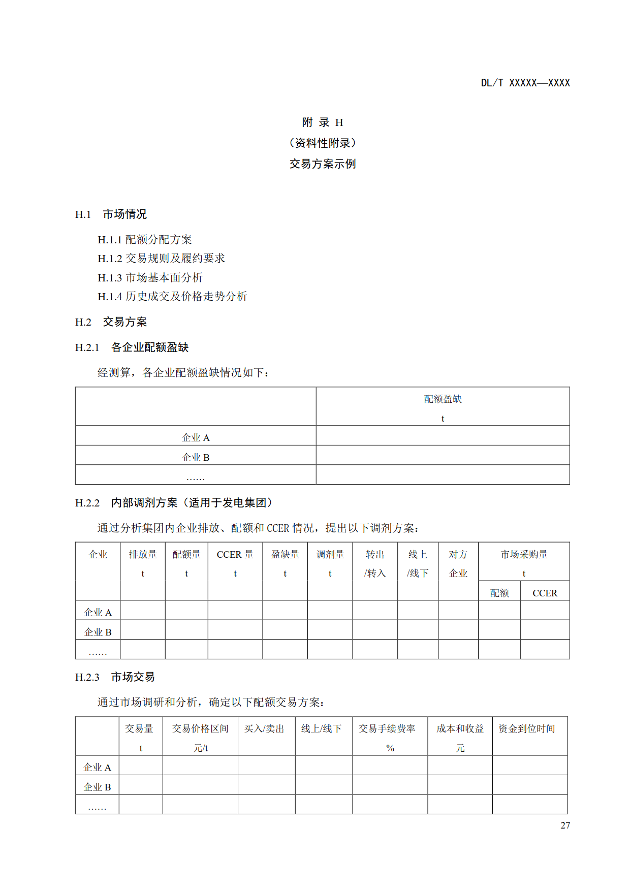 6.5.2.3.4 交易方案在企業(yè)配額盈缺測算和市場分析基礎上編寫,主要內(nèi)容包括交易方向(買入、賣出)、交易方式(線上交易、線下交易)、交易模式(現(xiàn)貨交易、衍生品交易等)、交易標的物(配額、CCER等)、交易價格、交易量、所需資金量及資金到位時間、交易成本收益等,對于集中管理的發(fā)電集團還應包含內(nèi)部調(diào)劑相關內(nèi)容,交易方案示例參見附錄H。
