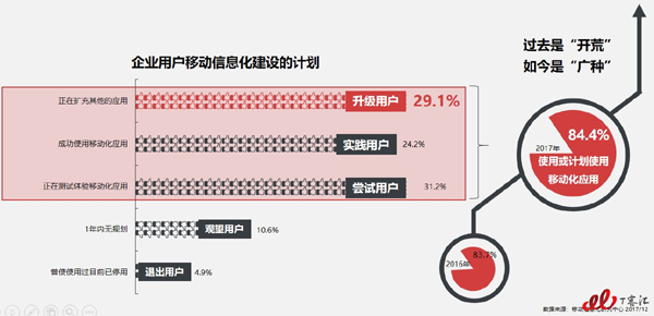企業(yè)移動(dòng)化的建設(shè)在2017年已達(dá)84.4%,同時(shí)有29.1%的企業(yè)用戶對(duì)業(yè)務(wù)進(jìn)行了移動(dòng)辦公的擴(kuò)充,顯然移動(dòng)化建設(shè)已經(jīng)不再是“要不要建設(shè)”,而是“怎樣建設(shè)”的問(wèn)題了。