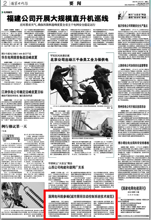 《國家電網(wǎng)報》2012年3月27日訊(葉舟)日前,國網(wǎng)電力科學(xué)研究院所屬南瑞集團確定成為住建部《城市照明自動控制系統(tǒng)技術(shù)規(guī)范》的參編單位,將于今年年底完成編寫工作。該技術(shù)規(guī)范的制定,是為了真正實現(xiàn)城市照明自動控制系統(tǒng)的節(jié)能效果,并在城市照明自動控制系統(tǒng)領(lǐng)域建立統(tǒng)一的技術(shù)規(guī)范體系。