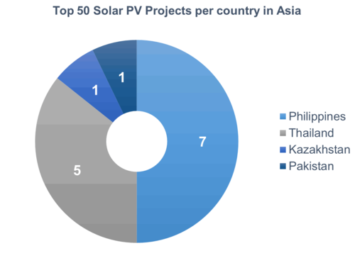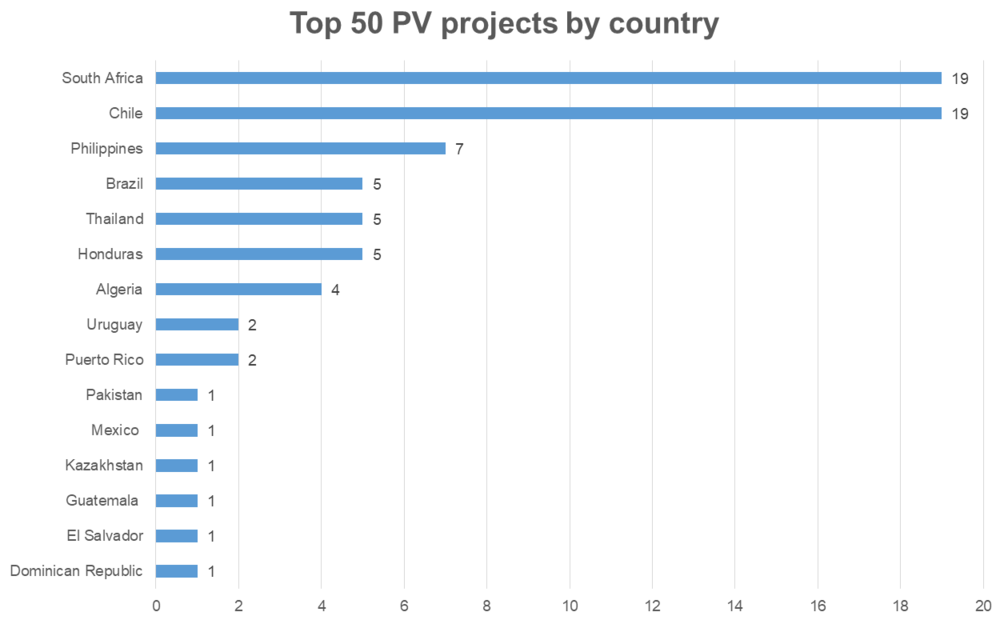 Solarplaza排名中認為,從數(shù)量上看,南非(19)、智利(19)、菲律賓(7)、巴西(5)、泰國(5)排在全球前五位。