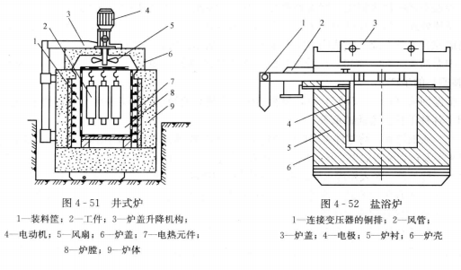 ③鹽浴爐是用液態(tài)的熔鹽作為加熱介質(zhì),加熱速度快而均勻,工件氧化、脫碳少,可進(jìn)行正火、淬火、化學(xué)熱處理、局部淬火、回火等,如圖4-52所示。