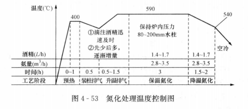 ①氮化,如圖4-53所示。加熱到590℃,保溫3h,停電隨爐降溫到540℃,利用爐內(nèi)余熱繼續(xù)通介質(zhì)氮化,可獲得良好的效果,前提是設(shè)備密封性好。用額定功率180kW、型號(hào)為SL02-35的井式氮化爐,處理同樣的產(chǎn)品,改進(jìn)后每條曲軸產(chǎn)品可節(jié)省20kWh。