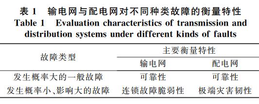 引入配電網(wǎng)韌性,是為了從總體上評(píng)估配電網(wǎng)受極端自然災(zāi)害這類(lèi)低概率事件的影響程度及其應(yīng)對(duì)能力。其對(duì)配電網(wǎng)的意義,類(lèi)似于連鎖故障脆弱性對(duì)輸電網(wǎng)的價(jià)值,如表1所示??梢?jiàn),對(duì)于發(fā)生概率較大的常見(jiàn)故障(例如線路短路、單一設(shè)備損壞),配電網(wǎng)和輸電網(wǎng)都是用可靠性來(lái)衡量:配電網(wǎng)常用的可靠性指標(biāo)包括SAIDI,SAIFI以及供電可靠性是多少個(gè)“9”;輸電網(wǎng)雖然沒(méi)有計(jì)算具體指標(biāo),但是采用了N-1校驗(yàn)標(biāo)準(zhǔn),用保守的運(yùn)行邊界限制確保輸電網(wǎng)具有足夠高的可靠性。