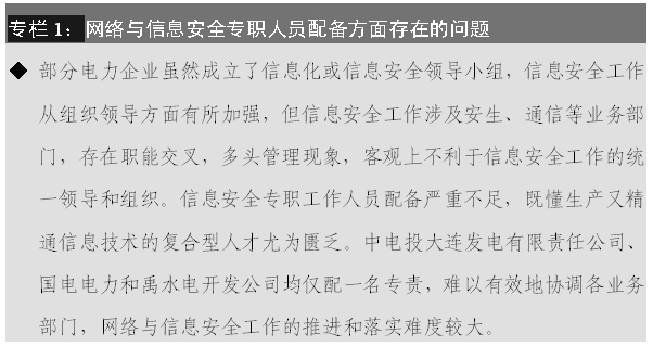 1. 部分電力企業(yè)網(wǎng)絡(luò)與信息安全工作多頭管理,職能交叉,缺乏統(tǒng)一領(lǐng)導(dǎo)和溝通協(xié)調(diào);信息安全工作人員配備不足,甚至身兼數(shù)職,不利于信息安全工作的落實(shí)。
