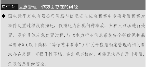 2. 部分電力企業(yè)對(duì)網(wǎng)絡(luò)與信息安全的應(yīng)急處置工作重視不足,應(yīng)急預(yù)案針對(duì)性、可操作性不足,應(yīng)急演練形式大于內(nèi)容,起不到發(fā)現(xiàn)問題、解決問題的作用。