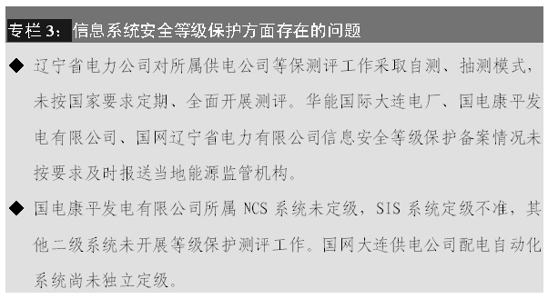 3. 部分電力企業(yè)對(duì)信息安全等級(jí)保護(hù)工作重視不夠,定級(jí)、備案、測(cè)評(píng)、整改等環(huán)節(jié)的各項(xiàng)要求落實(shí)不嚴(yán),主要體現(xiàn)在: