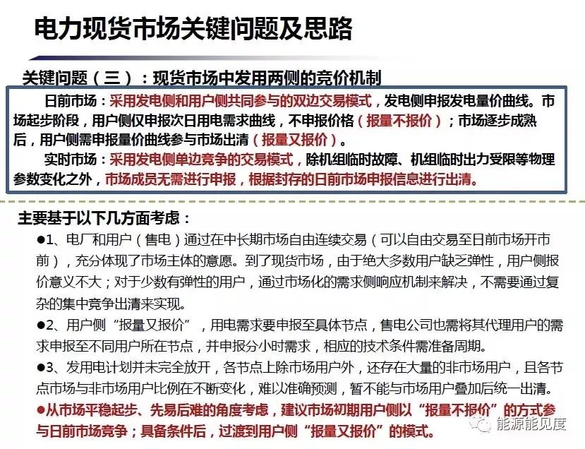 晶見思考:如果用電需求方需要申報(bào)價(jià)格,那么就需要考慮節(jié)點(diǎn)電價(jià)的問(wèn)題,用電需求要申報(bào)到具體節(jié)點(diǎn),大用戶還好說(shuō),可以明確具體節(jié)點(diǎn),像廣東市場(chǎng)的絕大多數(shù)售電公司如果要將其代理的所有用戶申報(bào)至不同用戶所在節(jié)點(diǎn),并申報(bào)分時(shí)段需求,這個(gè)挑戰(zhàn)太大了。