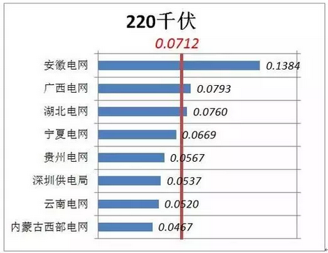 (5)220千伏:8省市平均為0.712元/千瓦時,其中,安徽最高為0.1384元/千瓦時,內(nèi)蒙古西部電網(wǎng)最低為0.0467元/千瓦時。詳情如下: