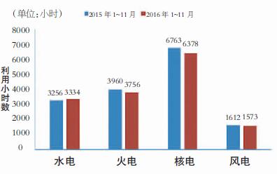 2015年、2016年1~11月各類型電源發(fā)電利用小時數(shù)對比