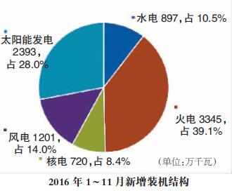 受煤電政策、環(huán)境約束等因素影響,2016年1~11月,全國新增裝機規(guī)模同比下降了5.4%,為8557萬千瓦。其中,火電新增裝機同比下降了30%,非化石能源新增裝機同比增長21%,比重進一步提升至60.9%,創(chuàng)下歷史新高。預計全年新增裝機規(guī)模將達到1.3億千瓦,同比下降1.7%。其中,非化石能源新增裝機比重為61.1%。期末總裝機容量達到16.5億千瓦,同比增長8.5%,非化石能源裝機比重達到36.2%,較2015年提高了2.1個百分點。