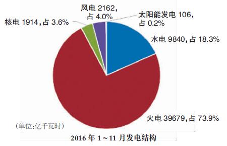 受電力需求回暖的帶動,2016年1~11月,全國發(fā)電量約5.4萬億千瓦時,同比增長4.2%,增速較2015年同期提高了4.1個百分點。其中,火電發(fā)電量同比增長2.2%,增速同比提高4.6個百分點。風電、核電發(fā)電量同比分別增長30.3%和20.5%,發(fā)電比重分別達到4%、3.6%。