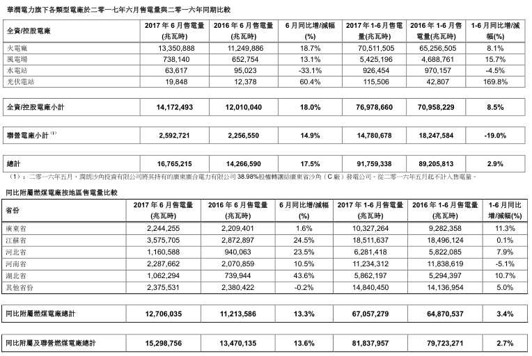 日前,華潤電力控股有限公司發(fā)布了2017年前6月售電量增加8 5%的公告。2017年6月華潤電力附屬電廠售電量達(dá)到14172493兆瓦時(shí),較2016年同期的12010040兆瓦時(shí)增長了18%。2017年前6個(gè)月附屬電廠累計(jì)售電量達(dá)到769786