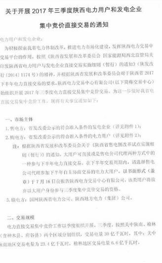 陜西電力交易中心日前發(fā)布了《關(guān)于開展2017年三季度陜西電力用戶和發(fā)電企業(yè)集中競價直接交易的通知》,此次交易電量30億千瓦時,分兩個區(qū)域組織交易,其中關(guān)中陜南區(qū)域交易電量23 4億千瓦時,榆林地區(qū)交易電量6