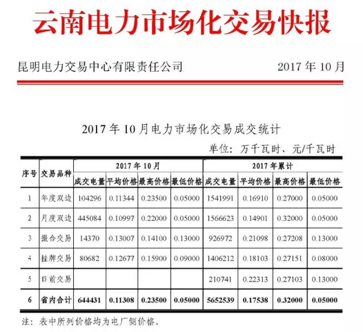 2017年9月30日昆明電力交易中心發(fā)布2017年10月云南電力市場(chǎng)化交易快報(bào)。2017年10月,云南省內(nèi)合計(jì)成交電量644431萬(wàn)千瓦時(shí),其中年度雙邊交易成交電量104296萬(wàn)千瓦時(shí),月度雙邊交易成交電量445084萬(wàn)千瓦時(shí),撮合交