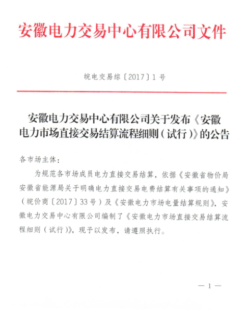參加安徽電力交易的看過來 《安徽電力市場直接交易結(jié)算流程細(xì)則(試行)》發(fā)布