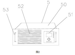 圖中:柜體-1、容量控制器-2、散熱柵-3、電抗器-4、雙向變流器-5、把手-6、連接孔-10、滾輪-11、匯流器-50、控制器-51、光伏陣列-52、扶手-53、控制按鈕-20、顯示屏-21、電源按鈕-22。