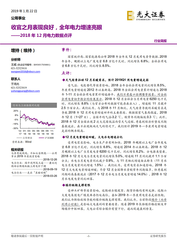 天氣因素拉動(dòng)12月采暖需求,預(yù)計(jì)2019Q1用電量增速走弱