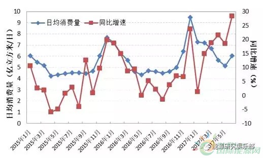 圖3 我國天然氣消費量(2015年1月至2017年6月)