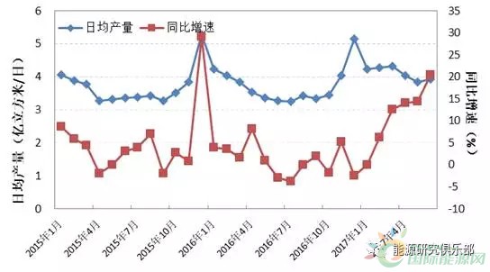 圖4 我國天然氣生產(chǎn)情況(2015年1月至2017年6月)