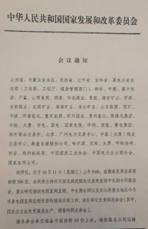 11日,發(fā)改委召集各地方工信委、工信廳、煤炭管理部門、各大能源集團(tuán)、各大電力交易中心、鐵路局、煤炭工業(yè)協(xié)會(huì)、電力企業(yè)聯(lián)合會(huì)等單位開(kāi)會(huì)。會(huì)議重點(diǎn)研究推進(jìn)電煤直購(gòu)直銷、中長(zhǎng)期合同及東北等重點(diǎn)地區(qū)今冬明春