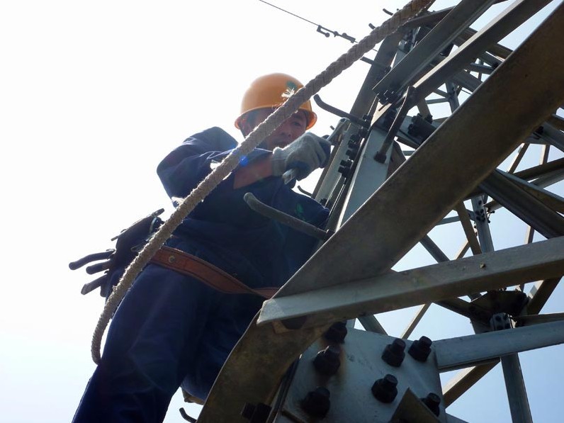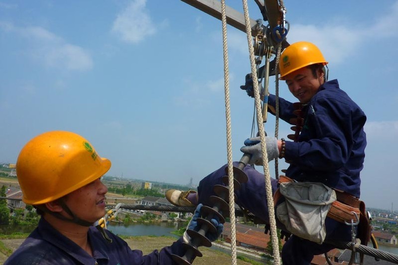 5月28日,嘉善局檢修建設(shè)工區(qū)工作人員正在鐵塔上進行消缺工作,對戶外電力設(shè)備進行更換技改處理,確保即將來臨的夏季高峰用電?! 榱吮WC電網(wǎng)安全迎峰度夏,嘉善供電部門加強對配網(wǎng)迎峰度夏工程的推進,今年