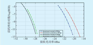 2種不同速率下的下行信號誤碼率(Bit-Error Rate,BER)曲線如圖8所示。在2.5 Gbps傳輸速率下,下行信號在正常與保護模式下有著非常近似的傳輸性能。當誤碼率在10-9水平上時,信號的接收功率需要大約-28.5 dBm。而由保護模式所產(chǎn)生的額外性能損耗要小于0.3 dBm。而在10 Gbps的傳輸速率下,正常與保護模式之間的傳輸性能差異擴大到了1.2 dBm。而在誤碼率為10-9情況下,2種模式下行信號所需要的最小接收功率分別為