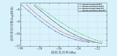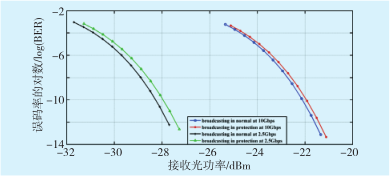 2.5 Gbps傳輸方案而言,在10-9的誤碼率水平上,信號所需要的最小接收功率在正常模式下為-28.7 dBm,而在保護模式下,則為-28.3 dBm。在2種模式間,有著0.4 dBm的額外性能損耗。而對于10 Gbps傳輸速率方案,在10-9的誤碼率水平上時,2種模式下的最小接收功率基本相同,皆為-22.5 dBm,也就是說,對于10 Gbps速率方案而言,共享保護模式對于廣播信號基本沒有影響。