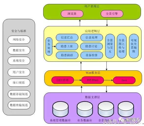 在橫向上,基于全景的輸電線路可視化運維管理需要滿足安全與標準體系的要求,包括數(shù)據(jù)存儲與傳輸規(guī)范、接口規(guī)范、網(wǎng)絡安全、數(shù)據(jù)安全、系統(tǒng)安全、用戶安全等(圖1為基于全景的輸電線路可視化運維管理的總體框架)。