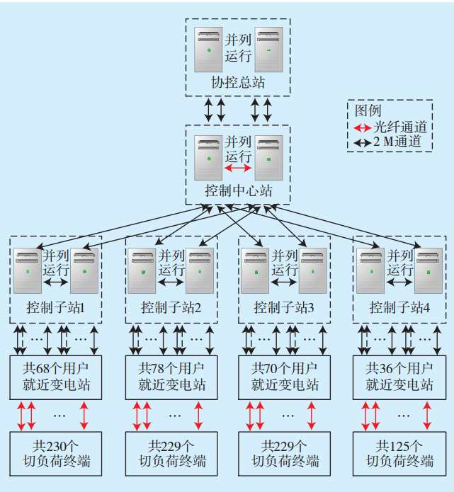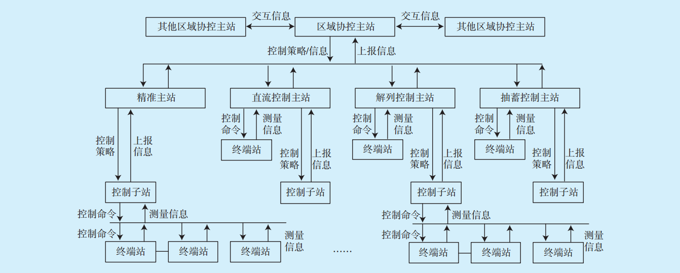 系統(tǒng)保護由區(qū)域協(xié)控總站、控制主站、控制子站和終端構(gòu)成。區(qū)域協(xié)控總站接收控制主站上傳的各直流故障信息、可切負(fù)荷信息等,給出決策或控制策略,并向各控制主站下達(dá)控制指令,進行負(fù)荷分配;控制主站負(fù)責(zé)收集各子站發(fā)送來的信息,同時也接收協(xié)控總站的控制指令,根據(jù)策略,向各子站下達(dá)控制指令;控制子站負(fù)責(zé)收集所轄終端的測量信息,匯總后上送至控制主站,并執(zhí)行控制主站發(fā)來的控制指令,將指令下達(dá)到具體的終端,子站主要起上傳下達(dá)的作用;終端負(fù)責(zé)將一、二次設(shè)備的測量信息上傳給控制子站,并接收控制子站的控制指令,快速切除故障或可中斷負(fù)荷[5]。