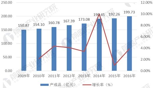 2009-2016年變壓器制造行業(yè)產成品及增長率走勢圖(單位:億元,%)
