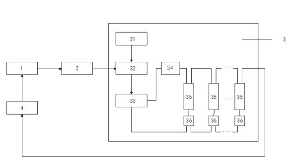 圖中:1-發(fā)電系統(tǒng),2-微電網(wǎng)中央控制單元,3-儲(chǔ)能系統(tǒng),31-能量管理系統(tǒng),32-儲(chǔ)能系統(tǒng)管理單元,33-電池組端監(jiān)測(cè)模塊,34-霍爾電流傳感器,35-儲(chǔ)能電池,36-電池在線監(jiān)測(cè)模塊,4-儲(chǔ)能變流器。