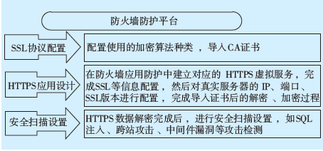 本文選擇的安全設(shè)備是布置在數(shù)據(jù)出入口的防火墻設(shè)備。選擇防火墻的原因有二:一是防火墻可對(duì)所有的數(shù)據(jù)流量進(jìn)行分析;二是防火墻可以對(duì)出入流量進(jìn)行基本的安全檢測(cè)。防火墻設(shè)備(即WAF設(shè)備)可對(duì)HTTP協(xié)議的傳輸進(jìn)行安全監(jiān)控,通過(guò)對(duì)其功能的開發(fā),也可以實(shí)現(xiàn)HTTPS的安全防護(hù)。