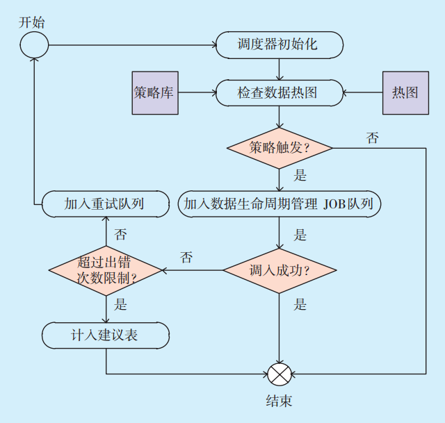 對照熱圖數(shù)據(jù),檢索策略庫,觸發(fā)條件后將request提交至數(shù)據(jù)生命周期管理引擎;考慮到策略引擎與數(shù)據(jù)生命周期管理引擎之間接口的強壯性,request進(jìn)入隊列后采用3次重試的方式,3次都失敗后計入建議表,等待人工介入進(jìn)行故障處理。