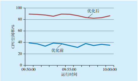 過自動優(yōu)化引擎優(yōu)化后的3個查詢業(yè)務(wù)均得到大幅度的提升。優(yōu)化之后系統(tǒng)壓力顯著下降,CPU空閑率從40%提升到90%(見