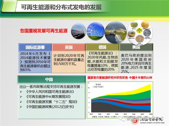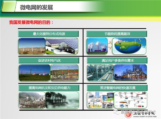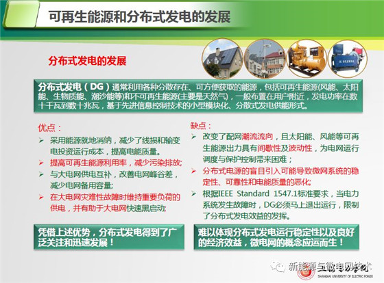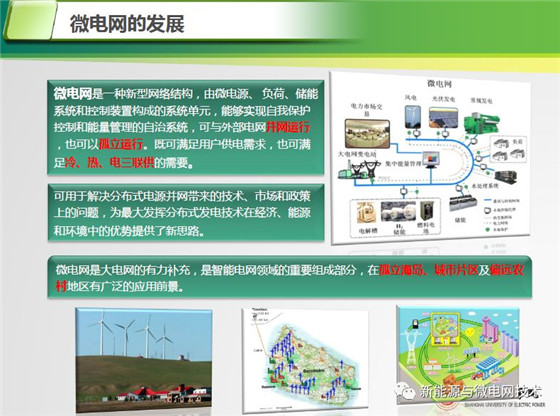 這部分有關(guān)可再生能源分布式發(fā)電。這里提出了一個對于微電網(wǎng)的主要思路,實際上也是為了分布式能源的并網(wǎng),因為這里面大致總結(jié)了一下分布式能源并網(wǎng)當中主要的優(yōu)點。但是如果完全無序并網(wǎng)的話,里面也會帶來一些缺點。這些缺點因為改變了配網(wǎng)潮流,給我們的保護會帶來困難。這個問題在德國分布式發(fā)電發(fā)展非常迅速,特別是分布式光伏。從我們跟他們的交流也能看到,德國在大量分布式光伏上網(wǎng)之后,對整個調(diào)度部門的管理也帶來了非常大的壓力。微電網(wǎng)大家也提出了理念,這些理念提的都不一樣。微電網(wǎng)基本上首先是要由分布式電源負荷儲構(gòu)成,并且是在用戶。所以說微電網(wǎng)大多數(shù)就是在的用戶層面來進行運行,并且也能夠并網(wǎng)運行也能夠自治運行等等。