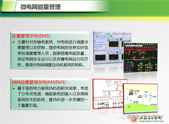 下面我們主要講一下微網(wǎng)的能量管理與優(yōu)化調(diào)度。微網(wǎng)的能量管理基本理念實際上是和大電網(wǎng)能量管理EMS系統(tǒng)轉(zhuǎn)化過來的。大電網(wǎng)EMS系統(tǒng)主要是對電網(wǎng)進行調(diào)度決策、管理以及控制,最終保證電網(wǎng)安全運行和經(jīng)濟運行,這就是我們說的大電網(wǎng)這一部分。微網(wǎng)能量管理系統(tǒng)基本理念和大電網(wǎng)是類似的,但是我微網(wǎng)規(guī)模小很多,同時里面融合了大量的分布式能源、儲能接入。微網(wǎng)能量管理跟大電網(wǎng)還是有很多不同。我們來看一下微網(wǎng)能量管理。通過管理微網(wǎng)的微源及負荷運行狀況,通過對分布式發(fā)電可控、儲能進行有功無功指令,最終是實現(xiàn)能源最佳利用并且使微網(wǎng)長期經(jīng)濟可靠運行,這是我們對能量管理系統(tǒng)綜合可靠定義。