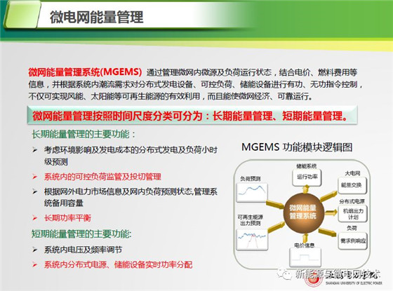 這里我們分為兩種,長時間的管理和一個短期能量管理。長期更多是考慮經(jīng)濟性和安全性,這個時候長期往往可能是以天為單位,甚至?xí)r間更長是以周為單位進行能量管理。這里要考慮環(huán)境影響以及發(fā)電成本、系統(tǒng)內(nèi)的可控負荷和大電網(wǎng)的信息等等方面的內(nèi)容。對于短期能量管理,就要在分甚至是秒的時間段。這里包括系統(tǒng)內(nèi)的頻率調(diào)節(jié)、分布式電源和儲能設(shè)備,整個微電網(wǎng)控制是結(jié)合起來的,也就是說響應(yīng)的速度要相對來說快很多。